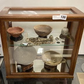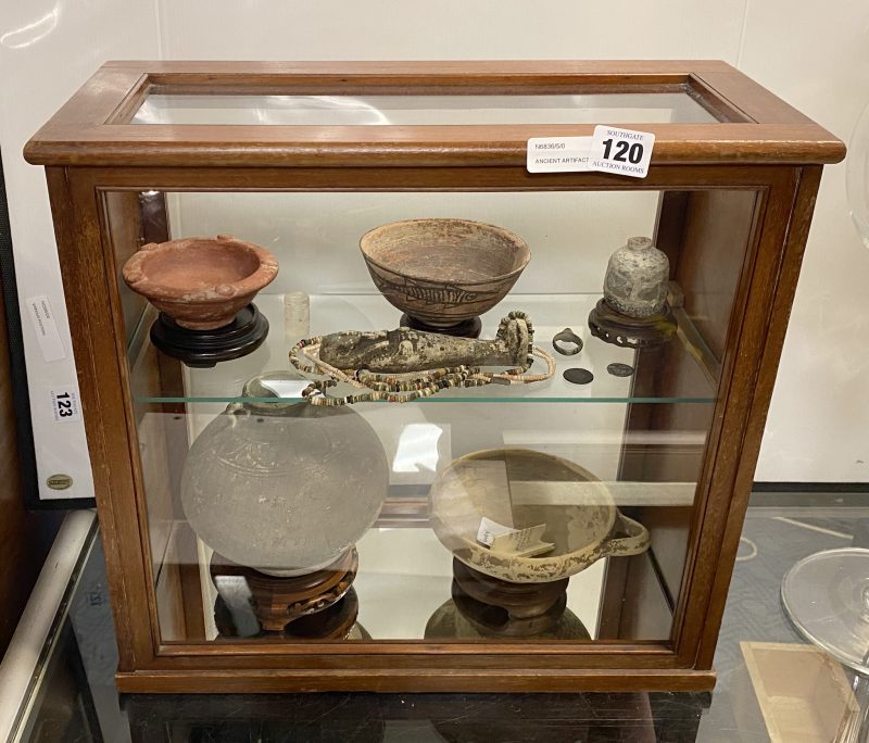 ANCIENT ARTIFACTS IN DISPLAY CASE - 12 ITEMS INCLUDING EGYPTIAN SHABTI & BEADS, SILVER & BRONZE COIN, ROMAN GLASS, COLOMBIAN FISH BOWL & MALAYSIAN NANHAI SHIPWRECK CELADON