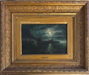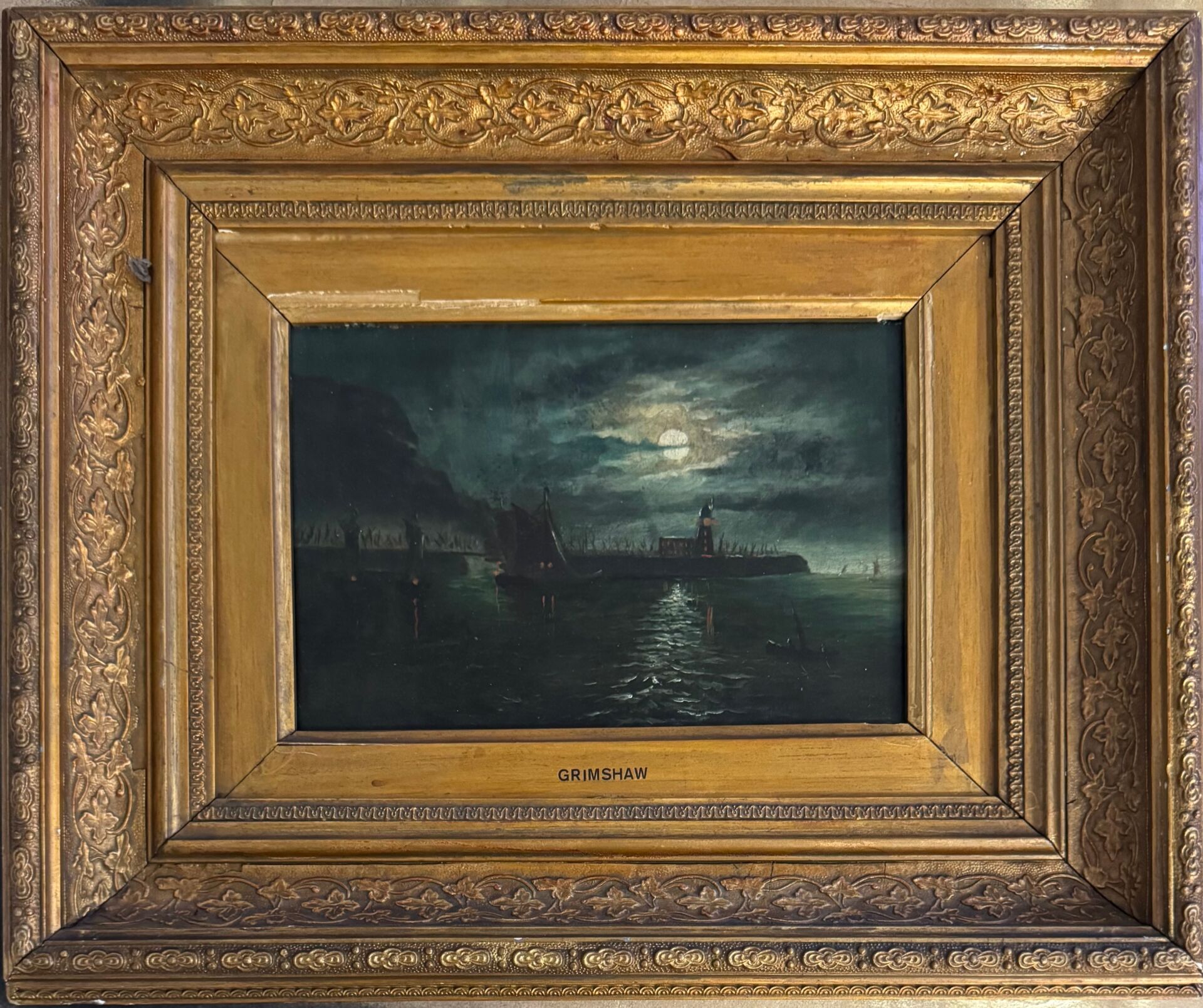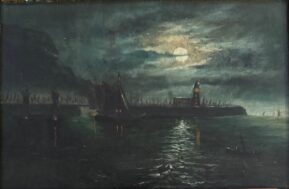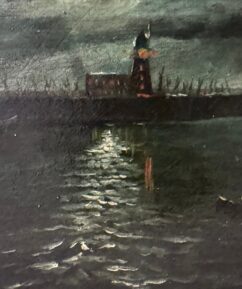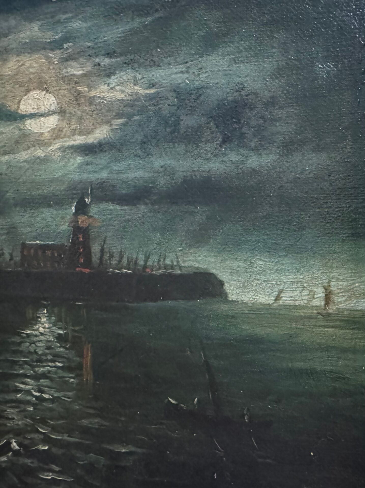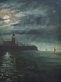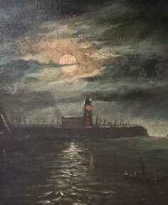 ATTRIBUTED TO JOHN ATKINSON GRIMSHAW (1836-1893) ''MOONLIT SEASCAPE WITH A LIGHTHOUSE'' OIL ON CANVAS 15.5CM X 23CM - GOOD ORIGINAL CONDITION