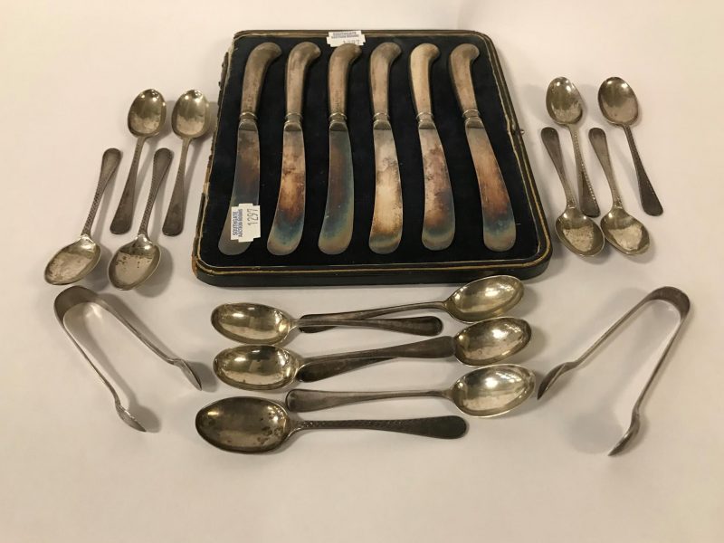 CASED HM SILVER HANDLED KNIFE SET & 9 BRIGHT CUT SPOONS, 5 TEASPOONS & 2 TONGS