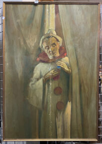 CLOWN PAINTING ON BOARD (A/F) 121CMS X 83CMS PIC ONLY APPROX
