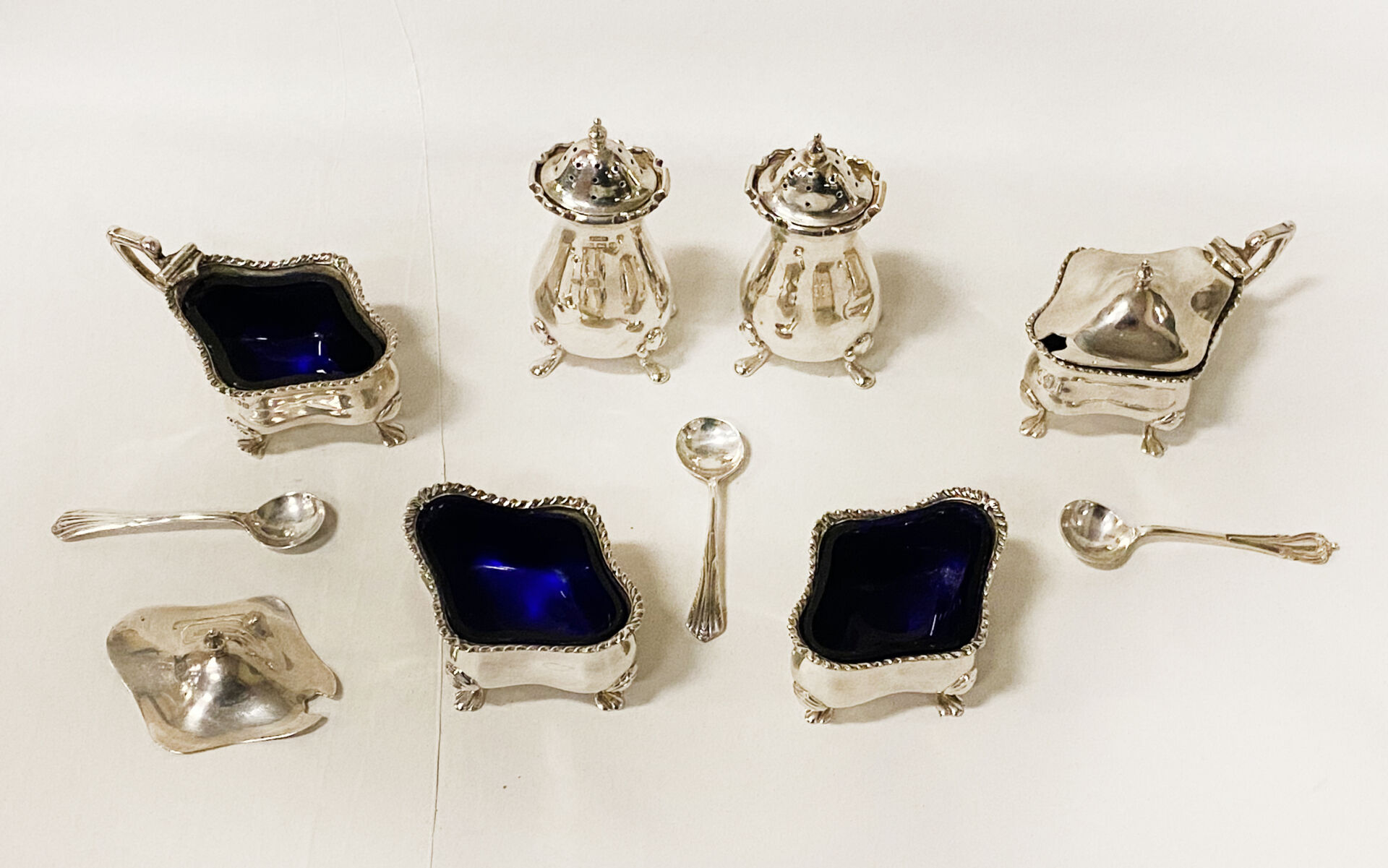FIVE VARIOUS CRUET ITEMS WITH 3 SPOONS 254 GRAMS APPROX