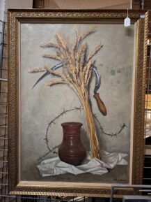 GILT FRAMED OIL ON CANVAS - STILL LIFE OF A SHEATH OF WHEAT WITH VASE & SCYTHE - SIGNED BOTTOM RIGHT