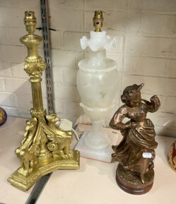 MARBLE TABLE LAMP, GILT WOODEN TABLE LAMP & BRONZE LADY