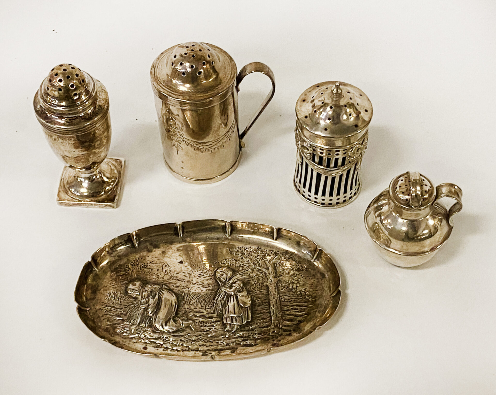 RELIGIOUS DEPICTION PIN DISH & CRUETS IN SILVER
