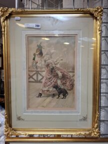 SIGNED MAURICE LELOIR PRINT - LADY WALKING HER DOG - 40CM X 28CM INNER FRAME