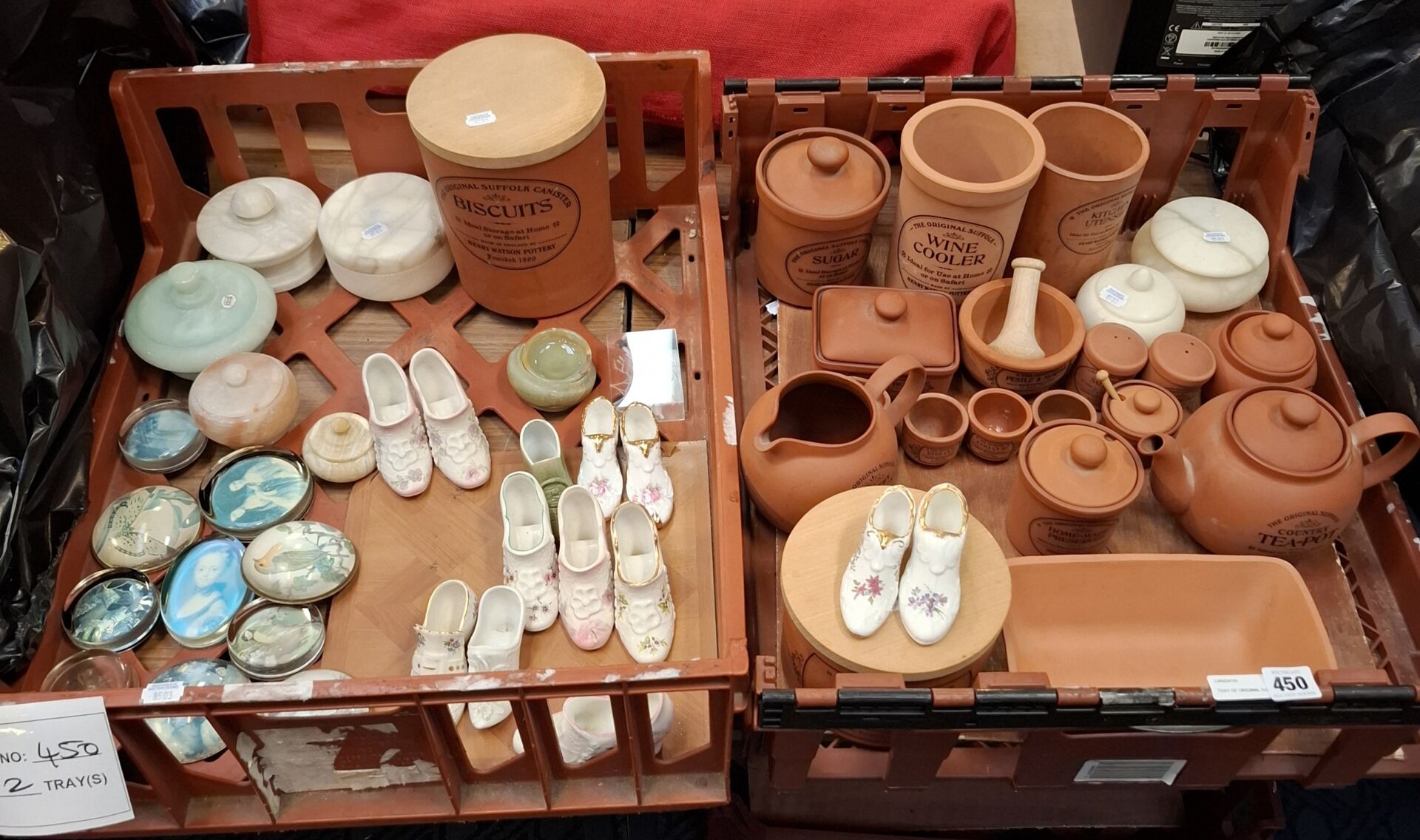 TRAY OF ORIGINAL SUFFOLK KITCHENALIA WITH A COLLECTION OF STONEWARE POTS, SHOE TRINKETS & PAPERWEIGHTS