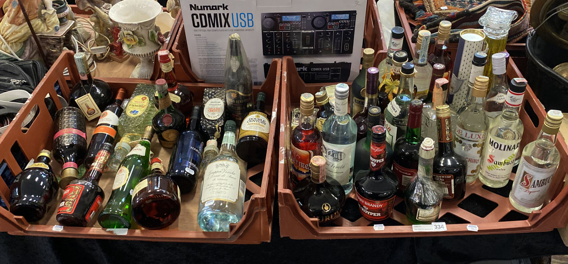 TWO TRAYS OF LICQUEURS & SPIRITS TO INCLUDE MADEIRA, GRAND MARNIER, COURVOISIER, SAMBUCA ETC
