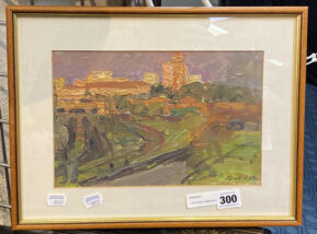 YURI GUSEV (1928-2012) ''SUNSET IN THE TOWN'' 1959 OIL ON BOARD 17CMS X 26CMS